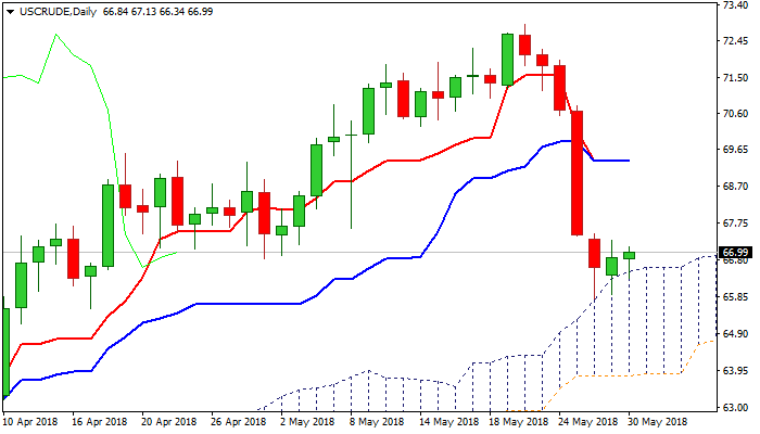 Bearish scenario requires final break and close below daily cloud top ($66.50) and also close below $66.04 (Fibo 61.8% of $61.80/$72.89) to generate strong bearish signal for continuation of fall from $72.89 (22 May low).