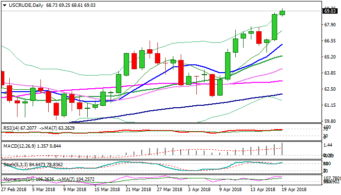 Strong bullish sentiment returned to play after brief $67.74/$65.55 correction, as weekly crude stocks fell more than expected (1.07 million barrels vs 0.5 million barrels draw forecasted), EIA report showed on Wednesday and Saudi Arabia continues to push for production cut, in order to further tighten oil market.