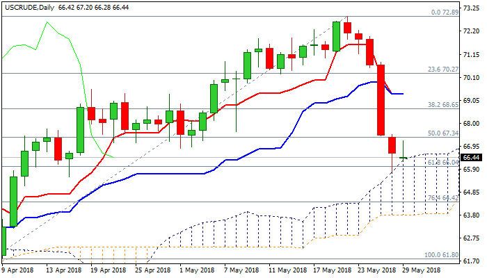 WTI oil remains in red on Tuesday and holding above six-week low at $65.76, posted last Friday, in extension of Thursday’s strong fall which marked the biggest one-day loss in one year.