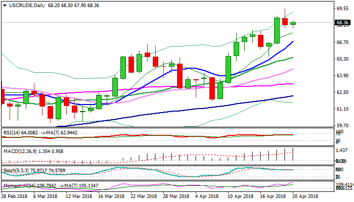 Daily studies remain in firm bullish setup and supported by positive sentiment which keeps bullish bias for fresh $70 + advance.