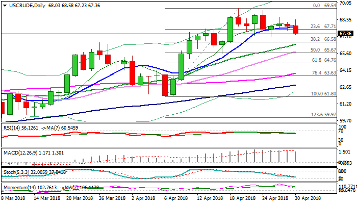 From the technical point of view, firm bullish structure on daily chart has been dented, as today’s extension lower broke below 10SMA, which contained dips during the past week and marking significant support (currently at $67.97).