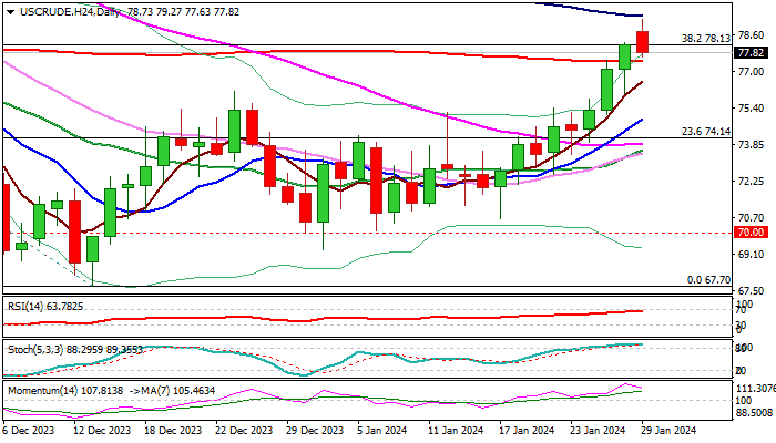 Extended pullback should find firm ground at $75.00 zone (near Fibo 38.2% of $69.27/$79.27 / rising 10DMA) to mark a healthy correction ahead of fresh push higher and attack of pivotal barriers at $79.73/$80.00 (100DMA / psychological).