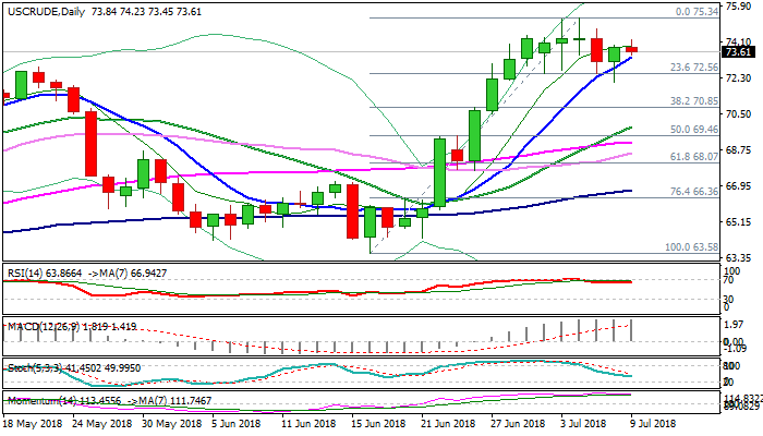On the other side, Doji candle on weekly chart warns of reversal, which requires firm break below $72.50 to generate bearish signal, while stronger reversal signal could be expected on extension and break below $70.85 (Fibo 38.2% of $63.58/$75.35 rally).