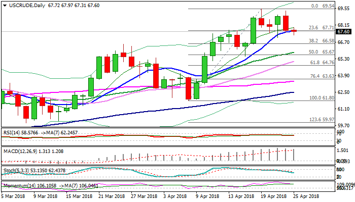 Another surprise build in oil stocks could spark fresh weakness for test of immediate support at $67.12 (Tuesday’s spike low) and pivotal support at $66.58 (Fibo 38.2% of $61.80/$69.54 upleg), loss of which would generate bearish signal for deeper correction.