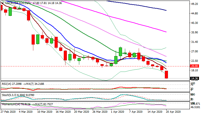 WTI oil future contract for May accelerated lower in early Monday’s trading and hit the lowest since 1999 on over 16% fall during Asian / early European trading.