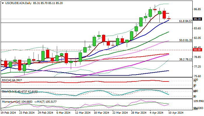 Technical picture on daily chart remains bullish (strong positive momentum / MA’s in bullish configuration), as pullback from $87.61 peak was contained by broken Fibo level ($84.57) and rising 10DMA, which tracks the uptrend for one month.