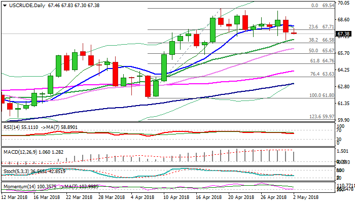 Break below $67.10 and next pivots at $66.88 (rising 10SMA) and $66.58 (Fibo 38.2% of $61.80/$69.54) is needed to generate stronger bearish signal and trigger deeper correction of $61.80/$69.54 upleg.