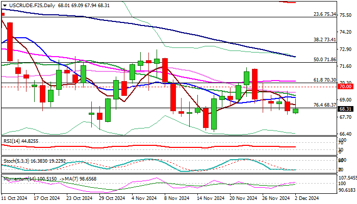 Oil price remains below psychological $70 level for the sixth consecutive day and also hold below converged daily Tenkan/Kijun-sen ($69.69), with near-term action being also weighed by last Monday’s large bearish candle (oil price was down 3.25% in the biggest daily fall since Oct 14).