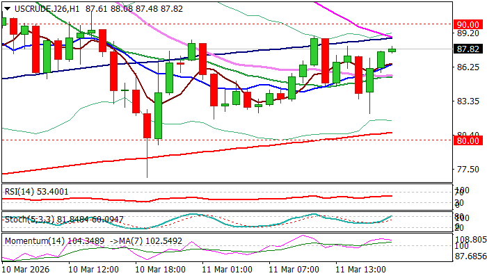 Long-legged Doji candle on Tuesday and today’s action being in similar shape, signal indecision, with significant barriers at $89.00 and $90, break of which to generate initial reversal signal and open way for stronger recovery.