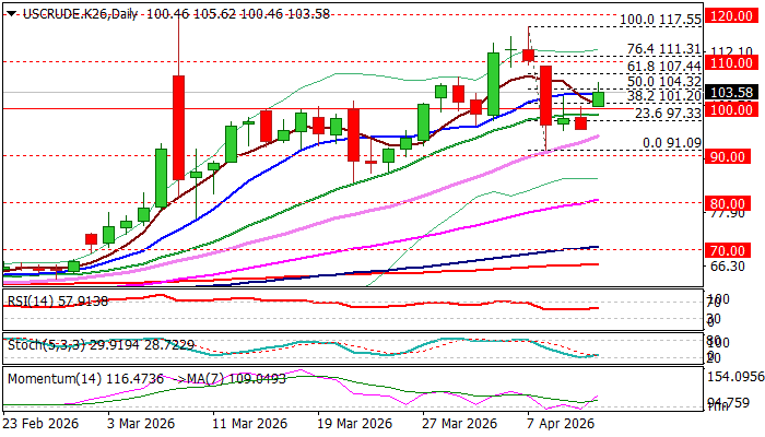Sustained break above cracked 50% retracement (104.32) to confirm strong bullish stance and expose targets at $107.44 (Fibo 61.8%) and $110.00 (round figure).