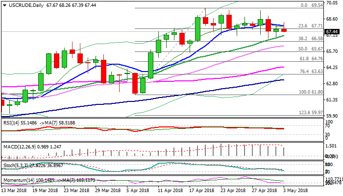 WTI oil price remains within two-week range and without clear direction, after repeated probes below range floor were contained by rising 20SMA, which marks initial support, currently at $67.08.