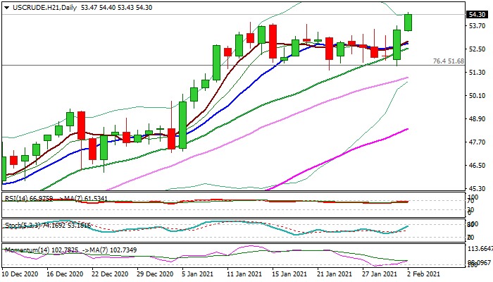 WTI oil extends rally on Tuesday, following previous day’s 2.95% advance and trades above $54 barrier for the first time in almost one year.