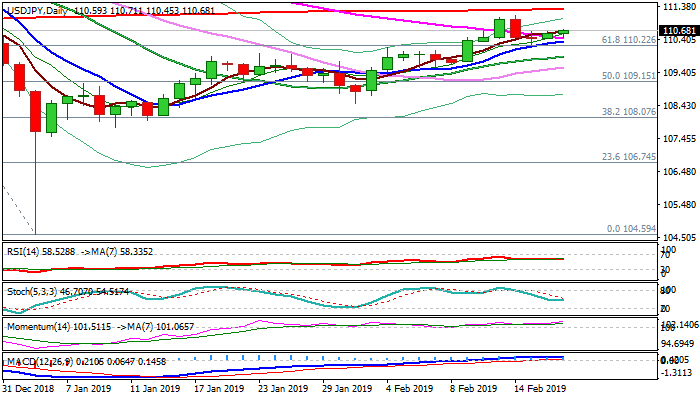 Fresh advance also broke above falling 55SMA (110.44), opening way for renewed attack at 111 zone and possible extension towards 200SMA (111.29), as bullishly aligned daily MA’s and strong momentum support scenario.